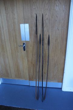 TWO ANTIQUE 19TH CENTURY SOUTH AFRICAN ZULU TRIBAL ART SPEARS, and two other African barbed fishing spears