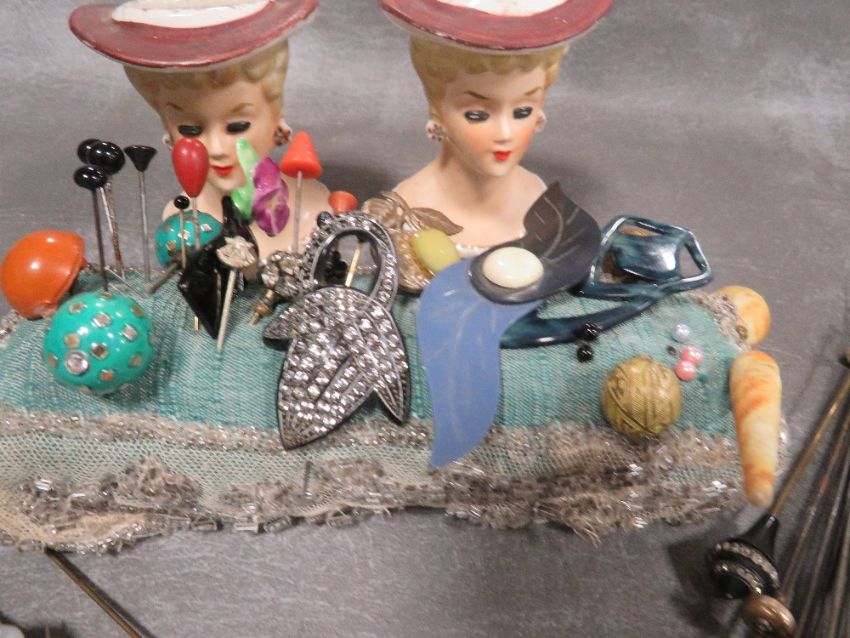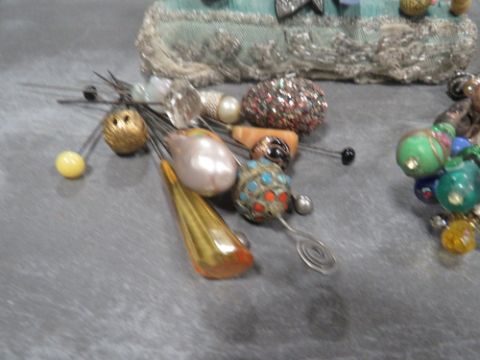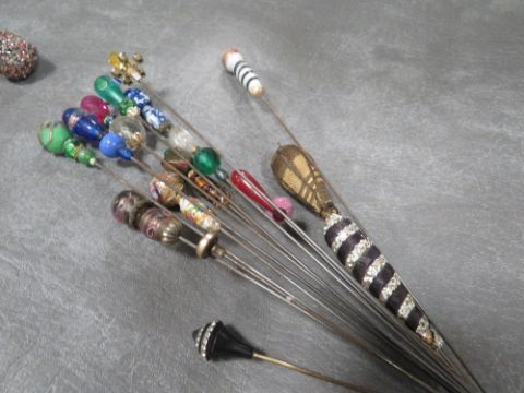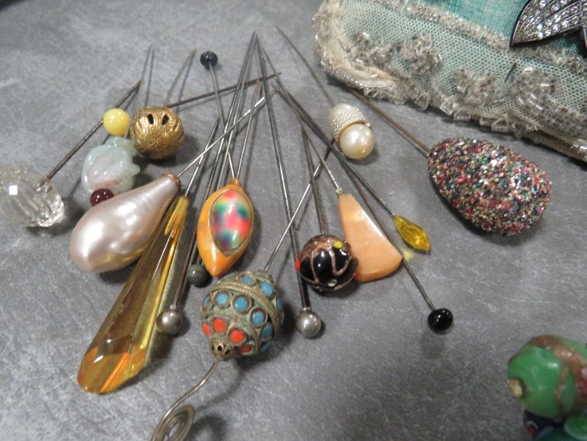A COLLECTION OF ASSORTED HATPINS, varying sizes, styles and periods, to include Art Deco Lucite hatpins, polished hardstone, jet, white and yellow metal examples and a Mexican style turquoise set example etc.
