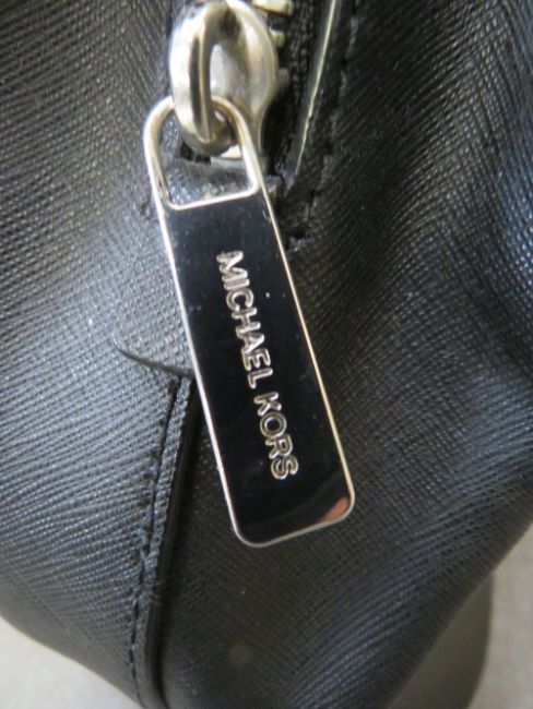 A MICHAEL KORS BLACK LEATHER HAND BAG, with twin carry handles and detachable shoulder strap, white metal hardware, H 24 cm, W 34 cm, D 12 cm