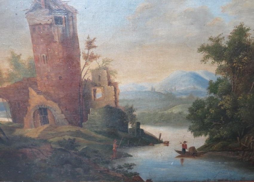 AFTER CLAUDE LORRAIN, 19th century mountainous river landscape with figures, boat, cottage and ruins, unsigned, oil on canvas, framed, 33 x 42 cm