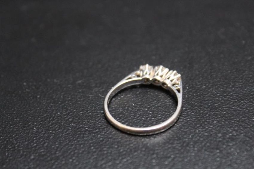 A HALLMARKED 18 CARAT GOLD DIAMOND TRILOGY RING, each diamond being of an estimated quarter carat, approx weight 4.4g, ring size V Condition: Inclusions visible under a x10 loupe, slight tint to colour but would probably improve with a clean