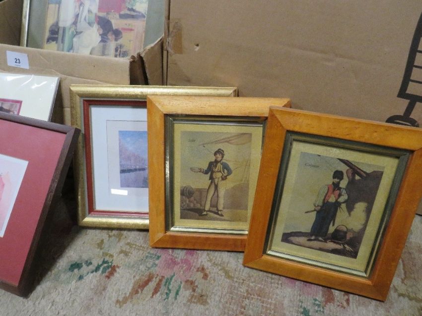 A box containing various framed prints together with a boxed Ikea Dudero lamp