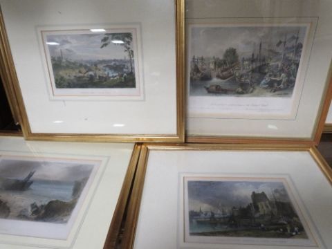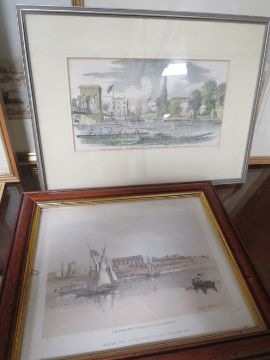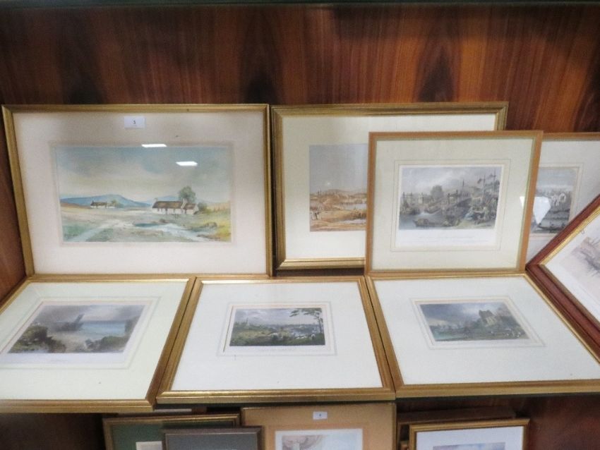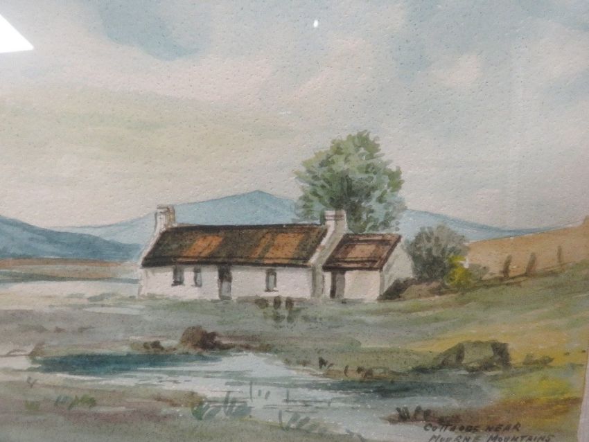 A selection of framed and glazed ;landscape paintings, engravings, pictures and prints, to include a watercolour entitled 'Cottage Near Mourne Mountains', signed Rowland Hill 1935