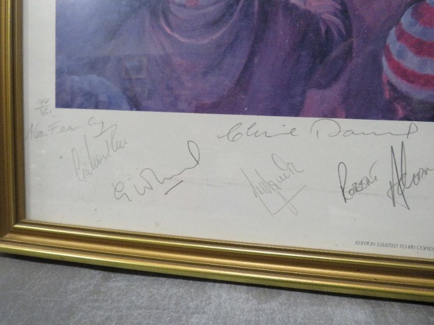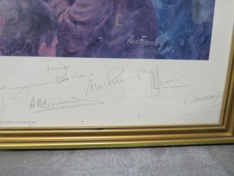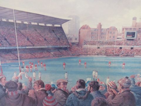 A large framed print of Cardiff Arms Park with various signatures