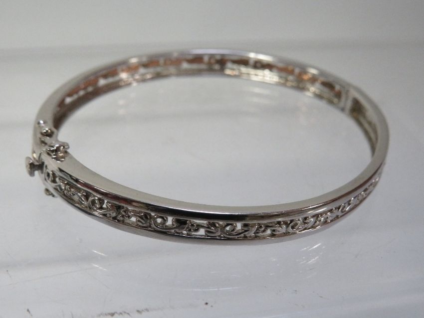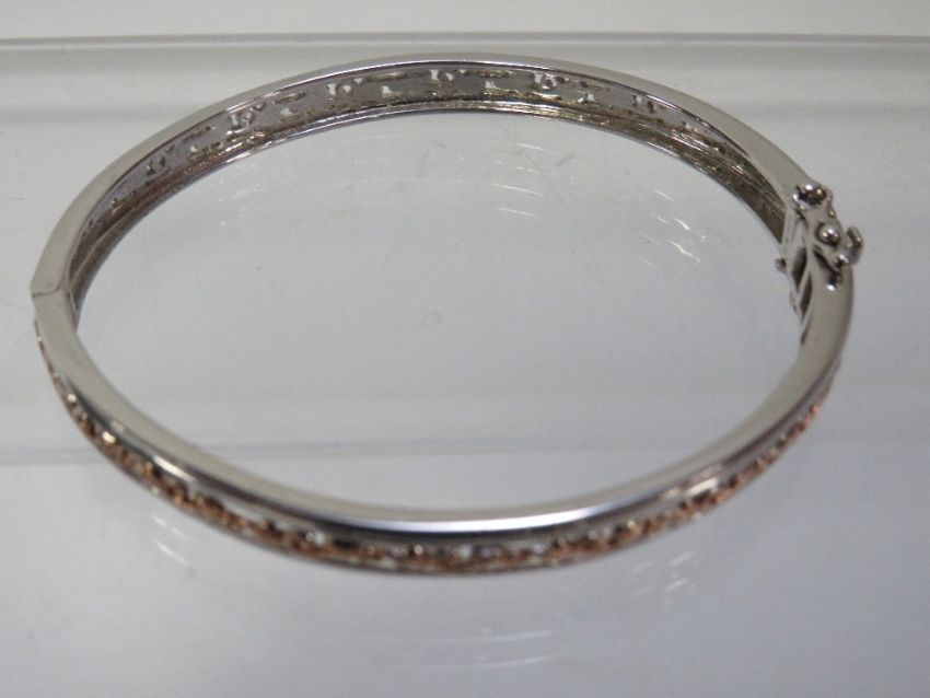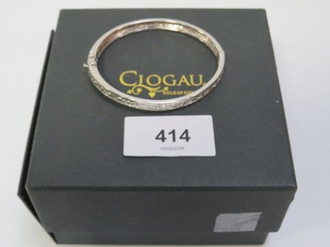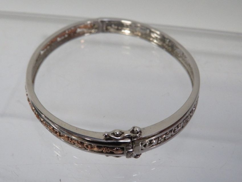 Clogau - a 925 silver bangle with Celtic design, central band half the bangle silver the other half gold colour with twin safety catches in Clogau box