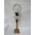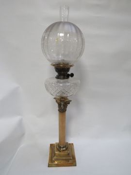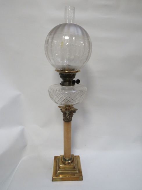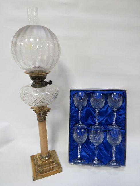 A tall column oil lamp with etched shade together with a set of six Schott crystal cut glasses