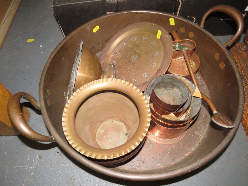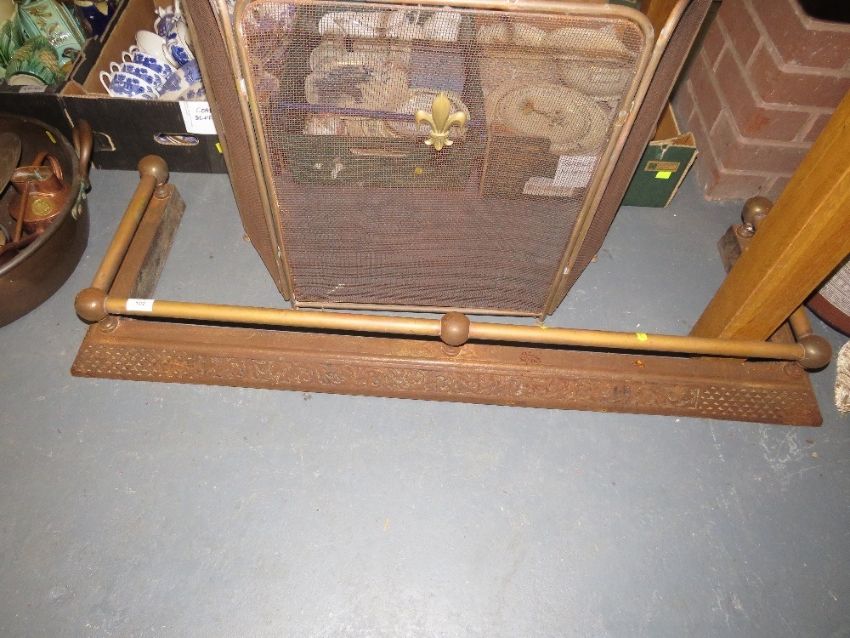 A quantity of metal ware to include a large twin handled stove top pan, fender etc