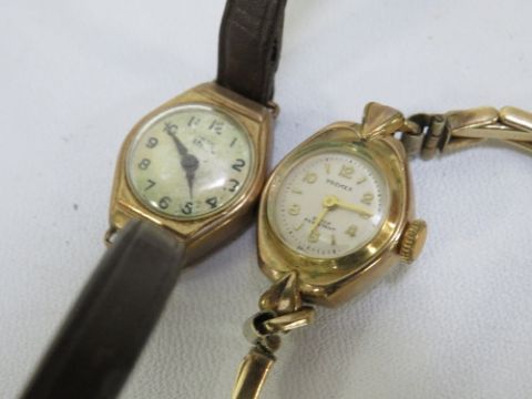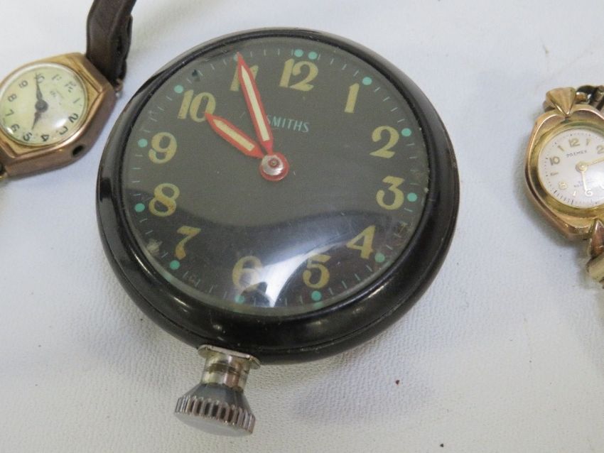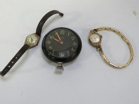 A vintage ladies gold wristwatch on leather strap A/F together with another and a Smiths military style pocket watch (3)