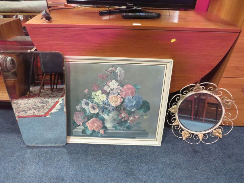 A mid century teak dropleaf table together with pictures, mirrors etc…