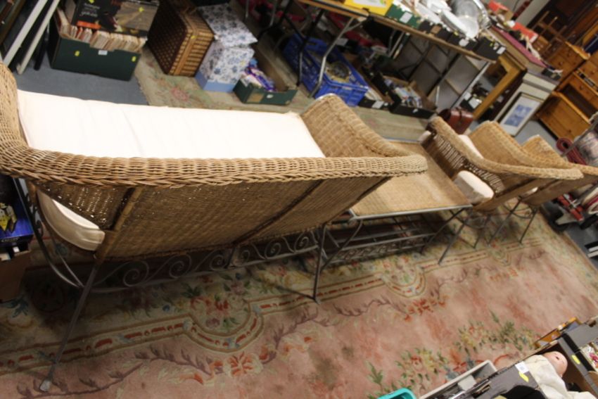 A four piece bent iron and wicker conservatory suite