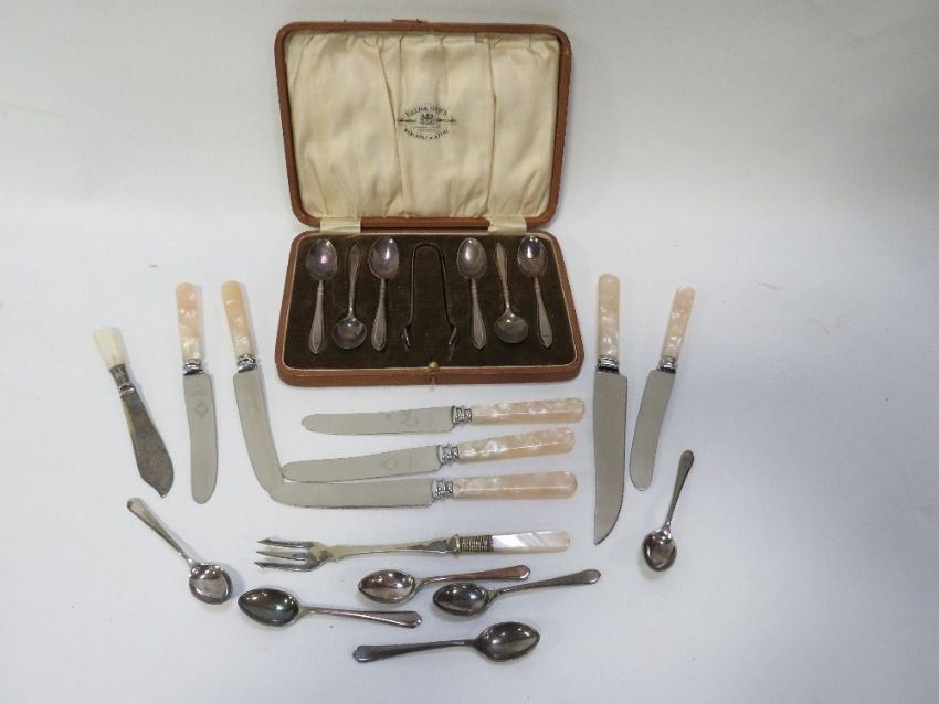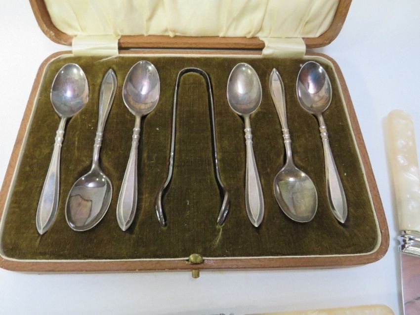 A cased set of hallmarked silver tea spoons and sugar tongs approx combined weight 84g together with a selection of silver plated ware