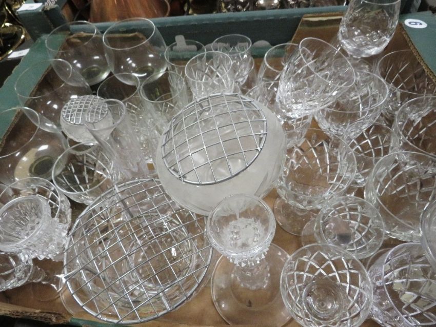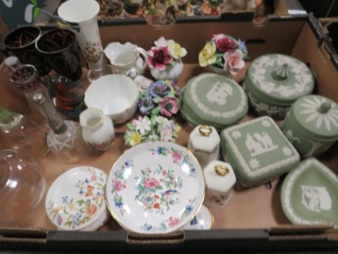 Three trays of assorted ceramics and glass to include, Wedgwood and Aynsley etc