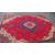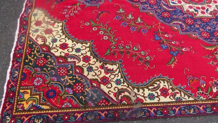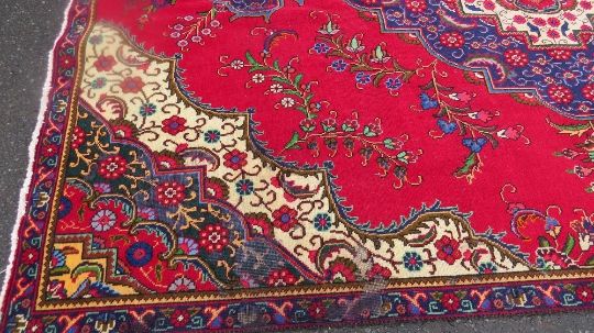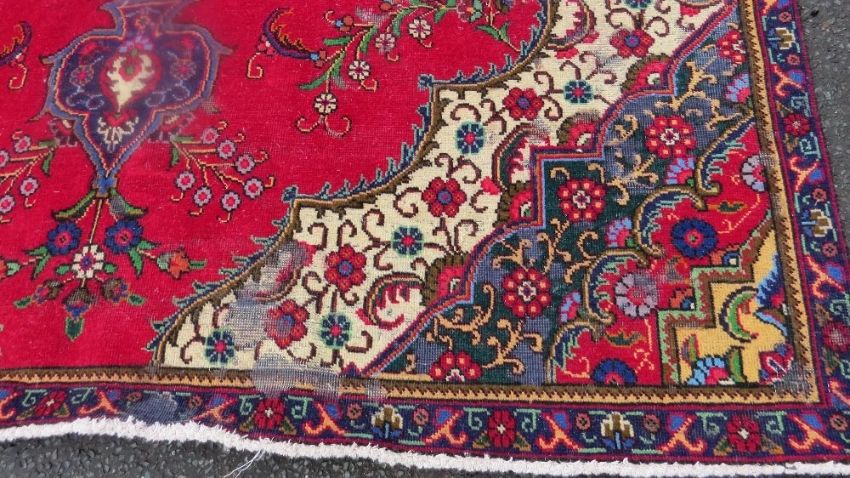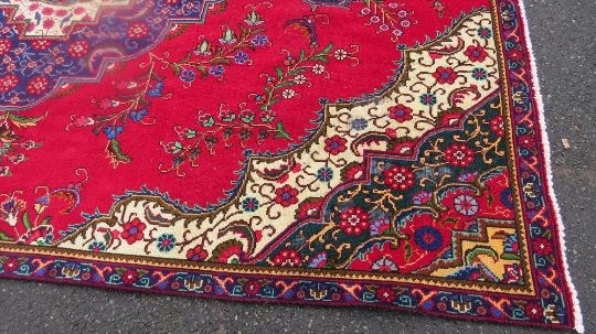 A large Oriental style woollen rug in red, green and blue colourway, with fringe
