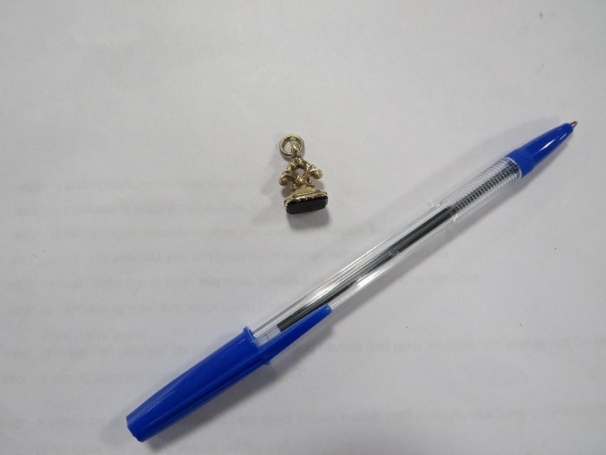 An unmarked yellow metal fob seal engraved FORGET THEE! NO!