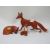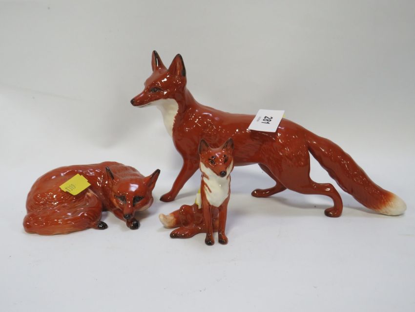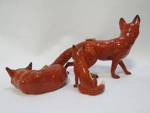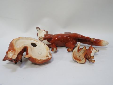 Three Beswick foxes seating, large running A/F and curled up