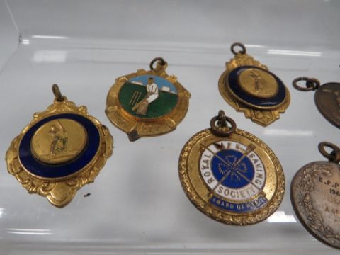 A tub of collectables to include medallions, pens etc