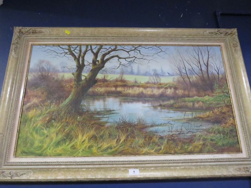 CHRISTOPHER OSBORNE. A large oil on canvas of a lake, framed, 50 x 90 cm