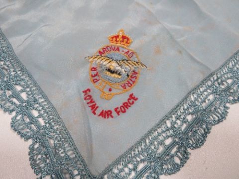 A tray of collectables to include coins, and a R.A.F handkerchief