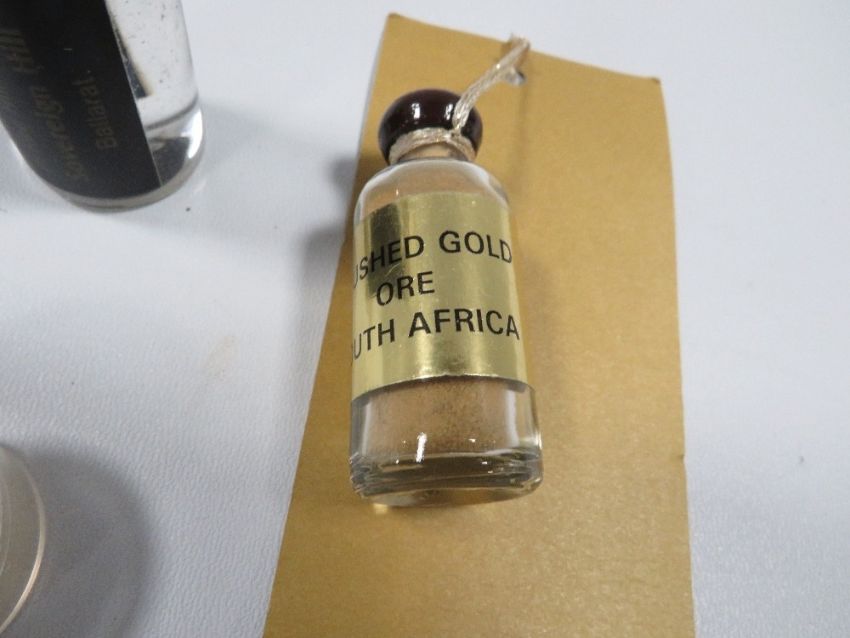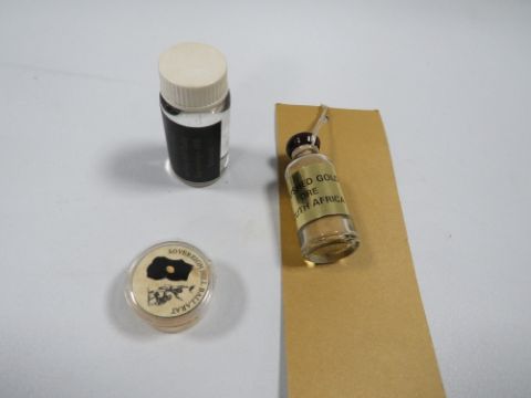 Natural gold samples, consisting of a flake and panned gold from Sovereign Hill Ballarat and crushed gold ore from South Africa