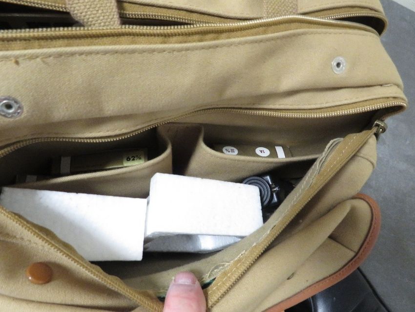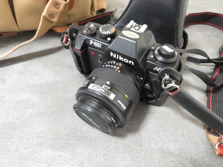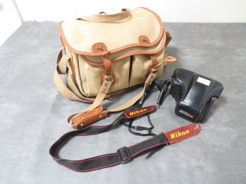 A Nikon F-501 camera and accessories in a vintage Billingham camera bag