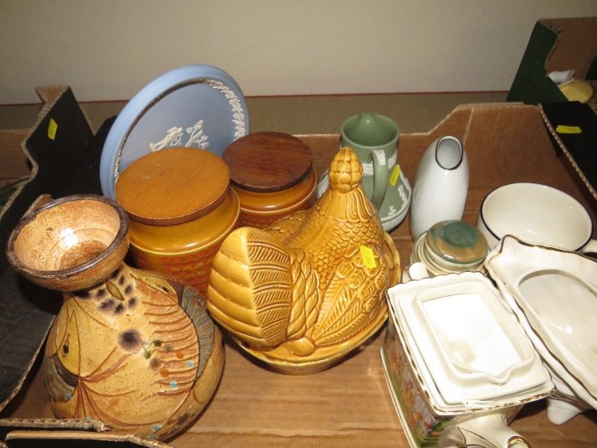 Two trays of assorted ceramics to include Wedgwood Jasperware etc