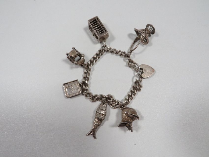 A silver charm bracelet adorned with 6 charms approx weight 52g