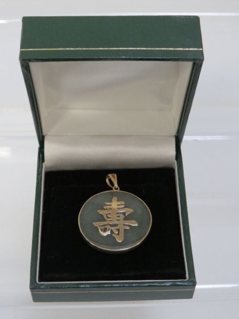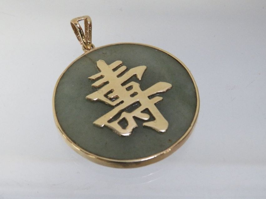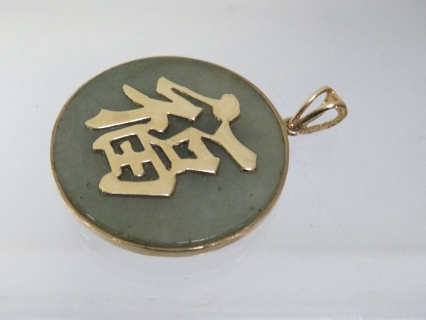 A hallmarked 9 carat gold and jade Chinese pendant dia 3cm