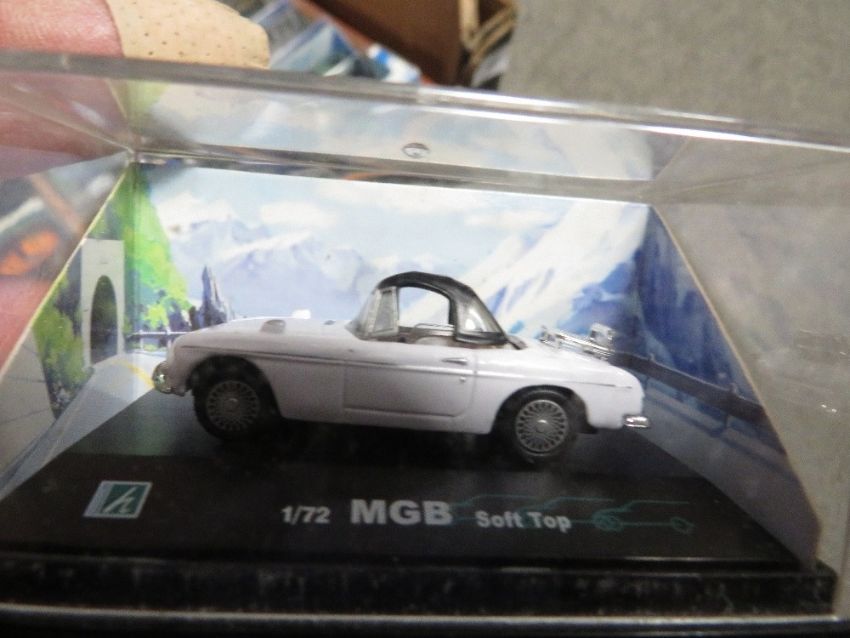 A box of small cased diecast cars
