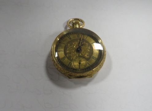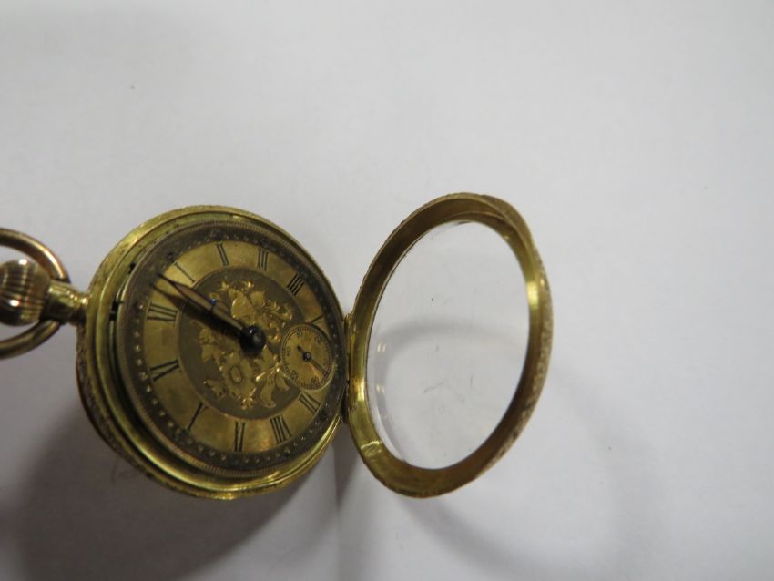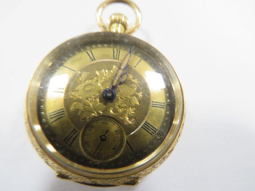 A gold 18k open faced manual wind fob watch approx weight 31.5g