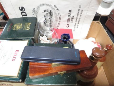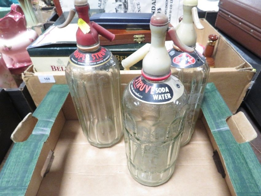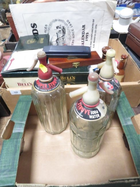 Two trays of assorted brewania etc to include vintage soda syphon's