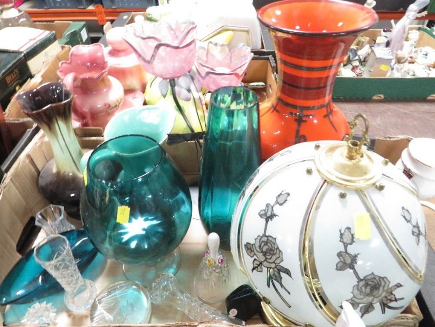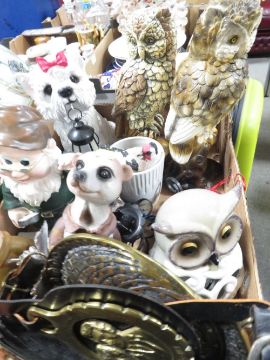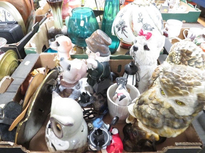 Two trays of assorted collectables and glassware to include meerkat figures etc