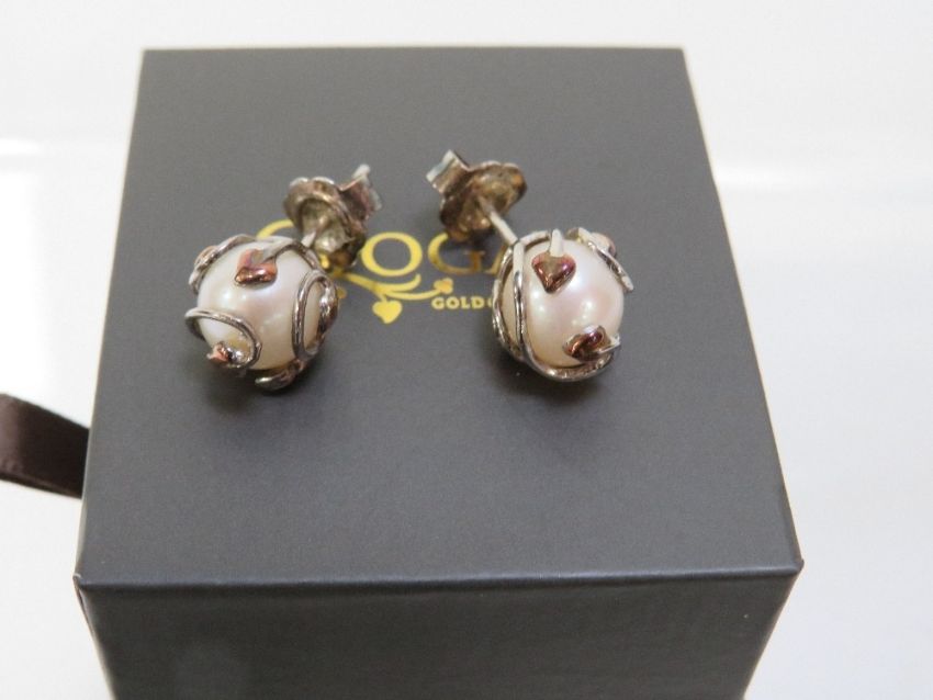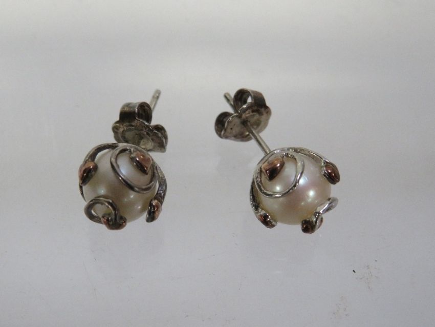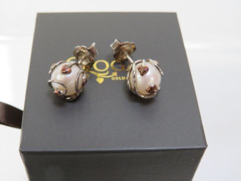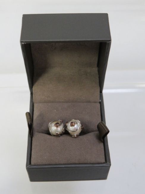 Clogau - a pair of hallmarked silver earrings featuring a cultured pearl encased in a wirework design with Clogau dragon stamp to central point in original Clogau box