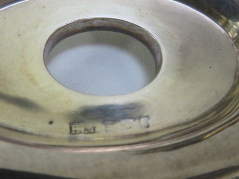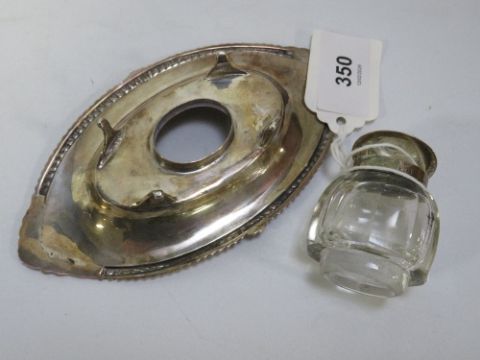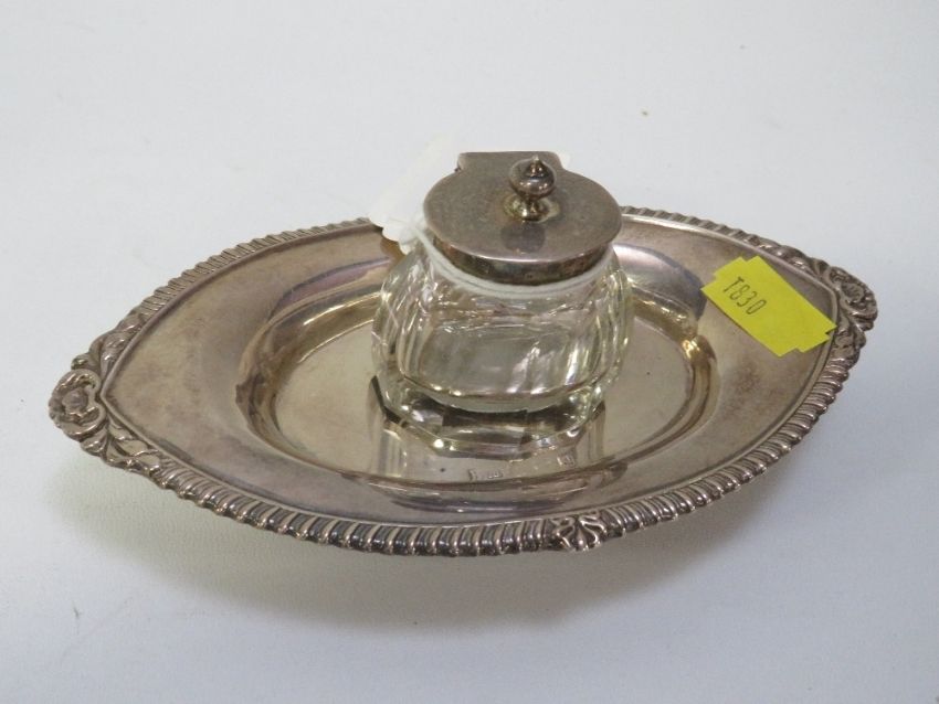 A hallmarked silver inkwell on a small hallmarked silver stand