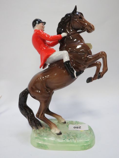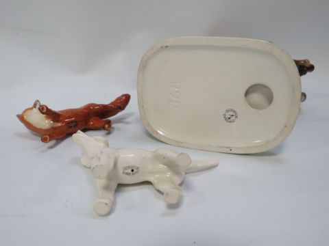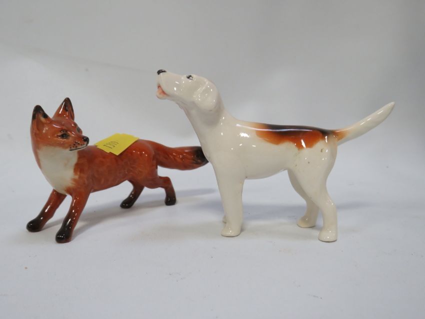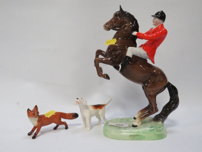 A Beswick rearing huntsman together a first version hound and a running fox - one ear missing from horse