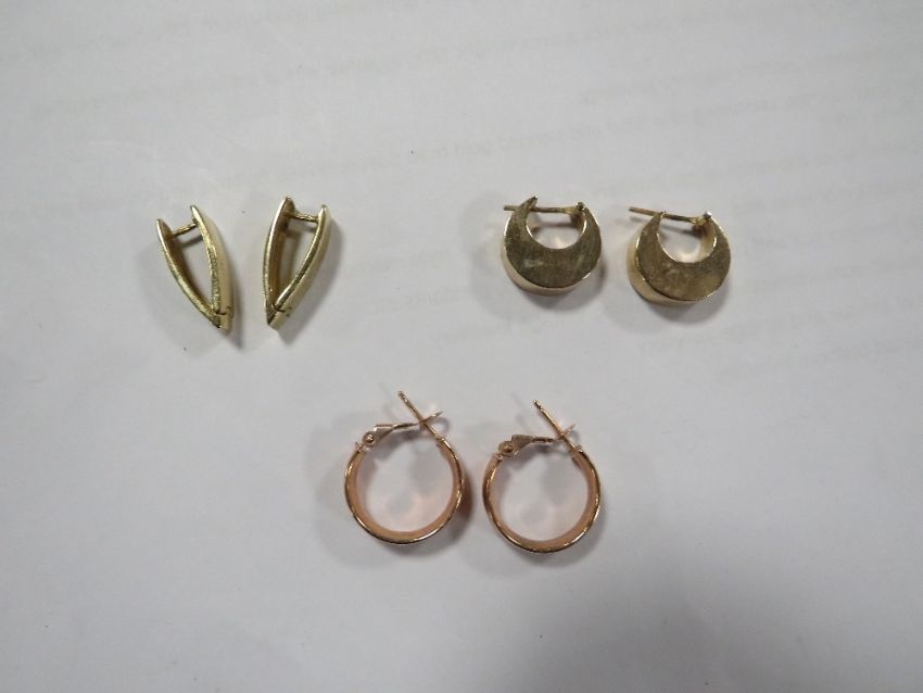Three pairs of 9 carat gold earrings to include rose gold example approx weight 9.8g