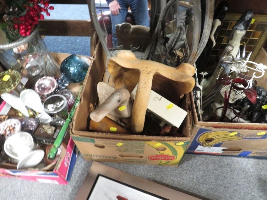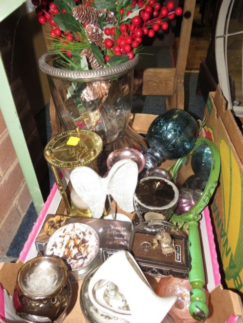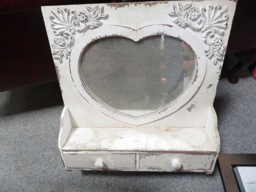 Three boxes of assorted display items together with a wall mounted heart shape mirror with drawers etc