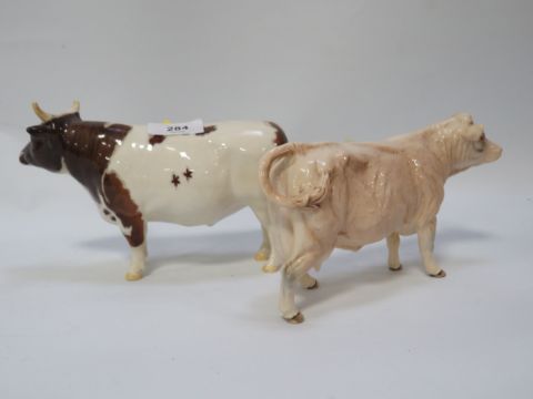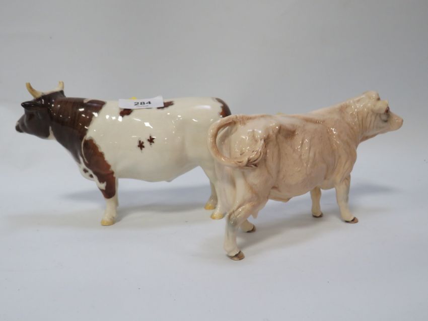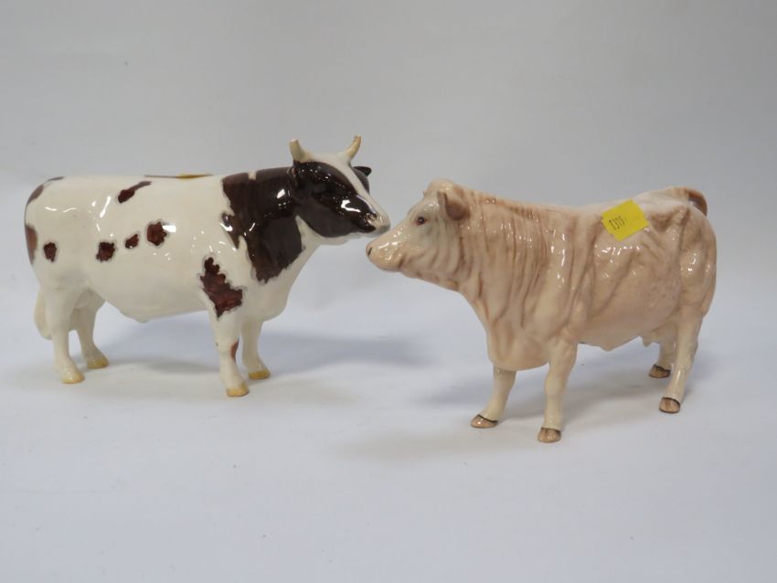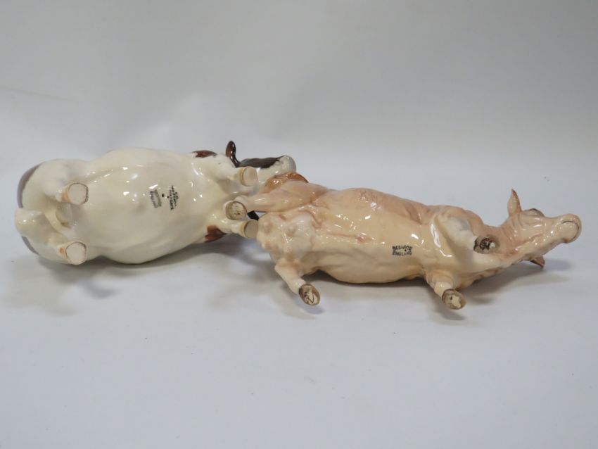 A Beswick Ayrshire Bull Whitehill mandate both horns broken together with a Beswick cow (2) - both ears missing from bull