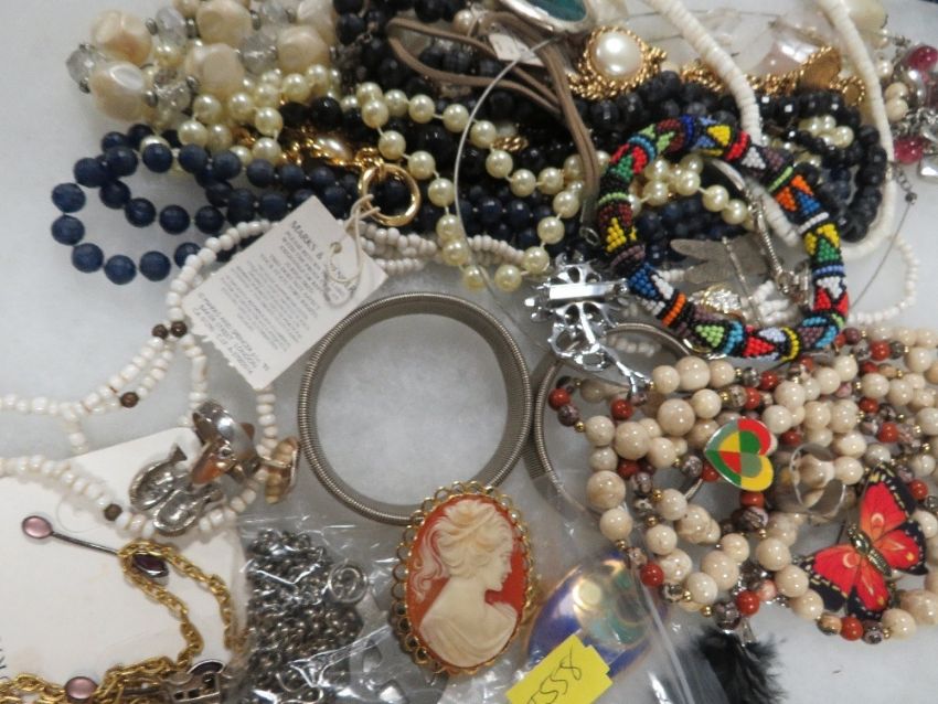 Two trays of assorted vintage costume jewellery to include a novelty hallmarked silver birth record spoon in fitted case