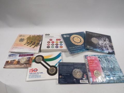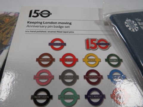 A collection of Royal mint uncirculated coin packs consisting of 1 pound coin 2016, 2 pound coins 2013 ( double pack ) and 2016 x2, 5 pound coins 1990, 2012, 2013, a set of keeping London moving pin badges and a quantity of loose coins