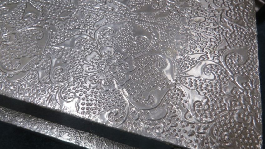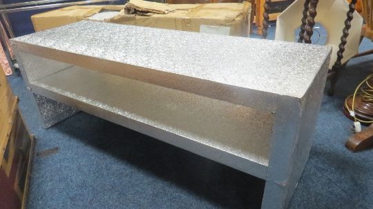 Two modern two tier tables in silver, with embossed finish, one boxed (Unchecked)