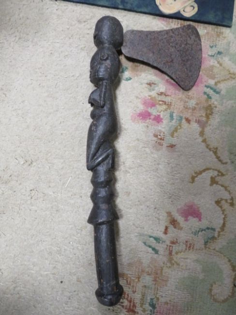 A large West African tribal art Nigerian batik textile, a large Congo axe, a Kente style cushion cover and abstract tribal figure carving