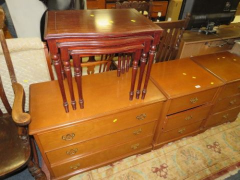 Two Stag three-drawer bedsides, together with a matching chest of three drawers and a nest of tables (4)