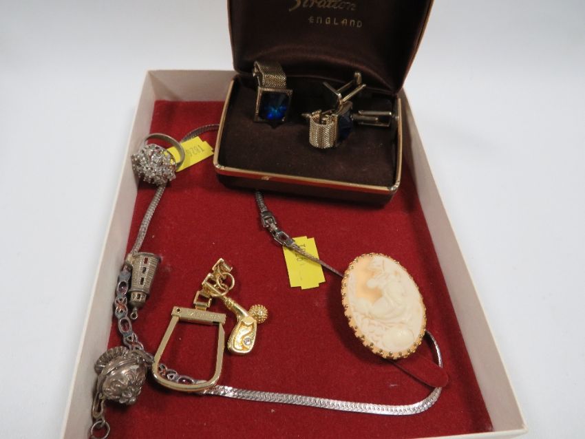 A quantity of assorted costume jewellery to include an engraved hallmarked silver clasp bangle