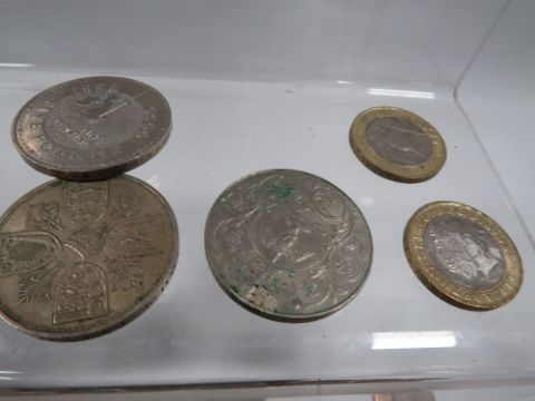 A tray of assorted coins to include a small selection of notes etc