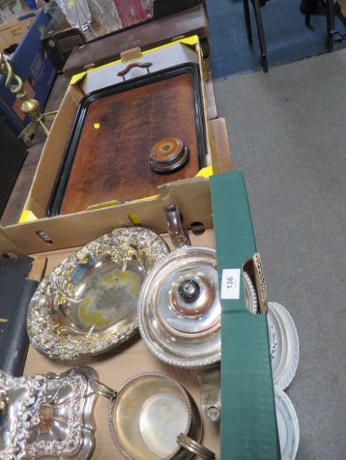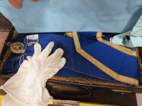 A tray of assorted silver plated ware etc together with a twin handled tray, barley twist smokers stand and a case of Masonic regalia