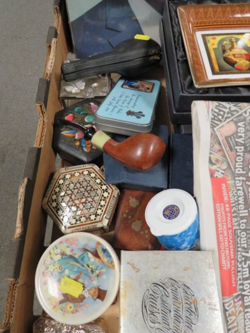 A tray of assorted collectables to include pipes together with a tray of assorted metalware etc. (2)