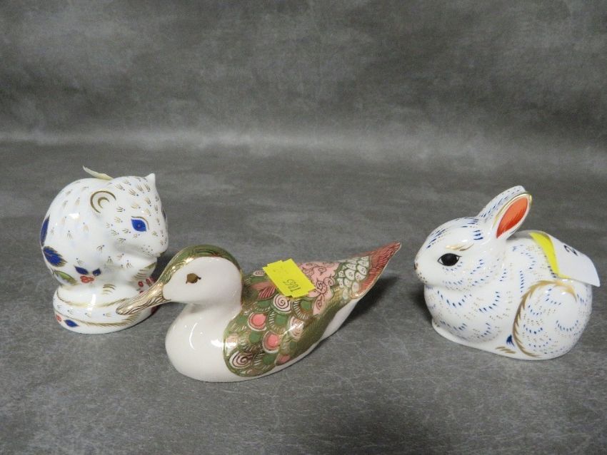 Two Royal Crown Derby Collectors Guild paperweights with gold stoppers - Bunny and Derby Dormouse together with another (3)