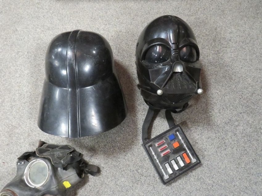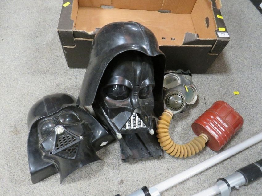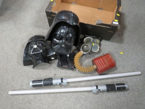 A tray of Darth Vader Star Wars masks plus a lightsaber