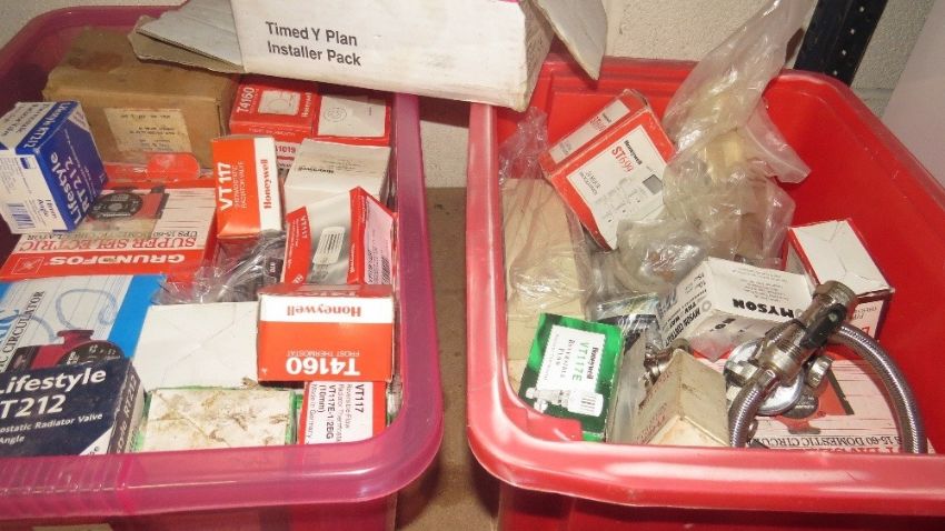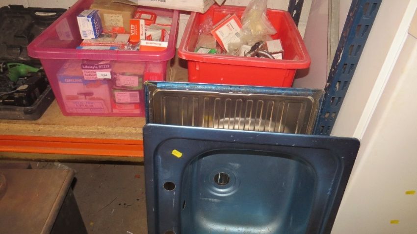 Two trays of plumbing items, to include radiator thermostat valves, central heating circulator pumps etc., together with two stainless steel sinks