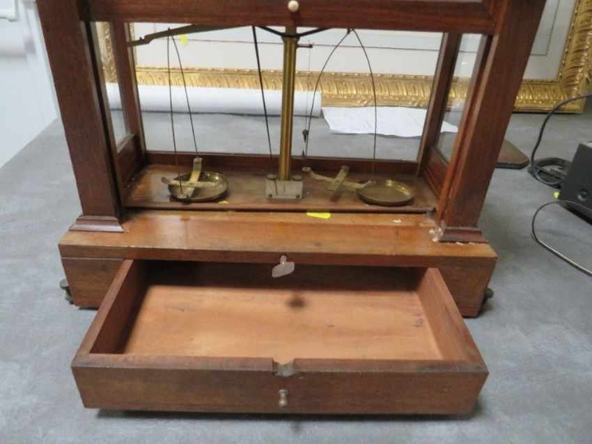 Antique scientific scales in glazed wooden case